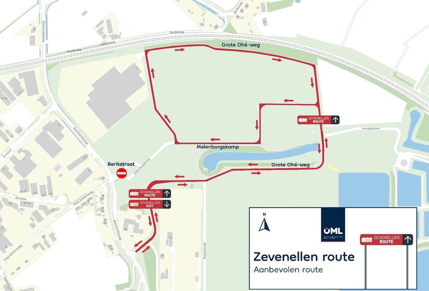 De tijdelijke weg aan de andere kant van het terrein (Berikstraat) kan namelijk hinder geven. Via de zuidelijke kant voorkomt u problemen.